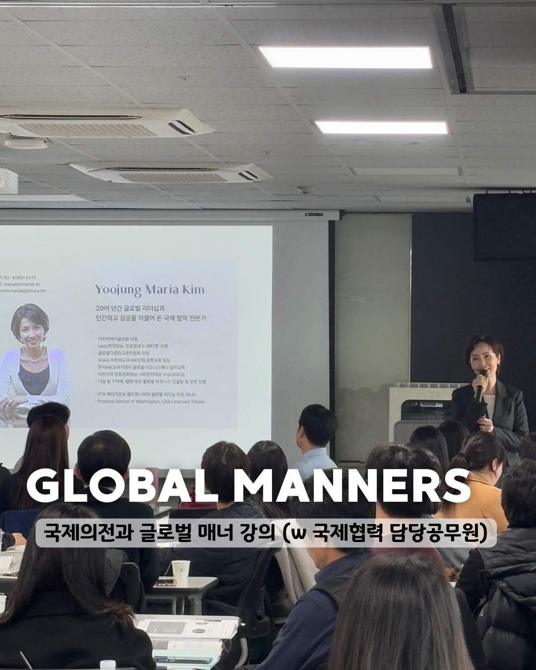 44 | 글로벌 커뮤니케이션 교육 | ![]() 글로벌 매너 강의- 국제행사 의전과 시도지사협의회 | 2025-11-19 | ![]() 우리가 하는 일 > 글로벌 커뮤니케이션 교육 글로벌 매너 강의- 국제행사 의전과 시도지사협의회 | 2 |